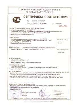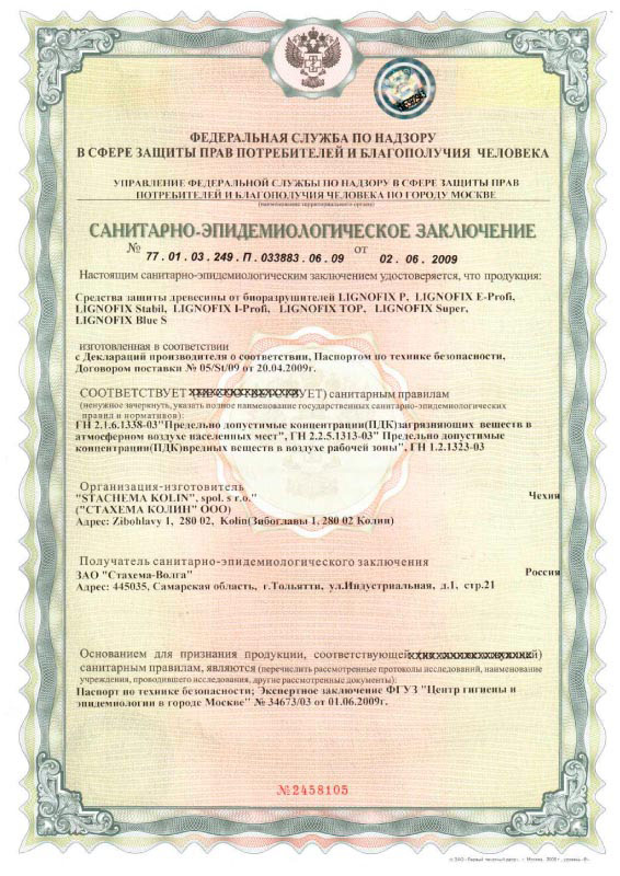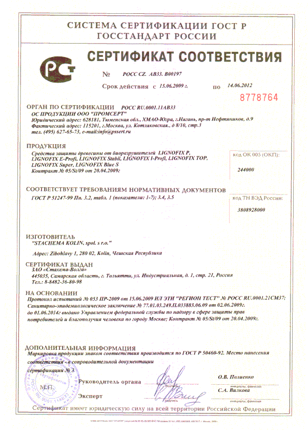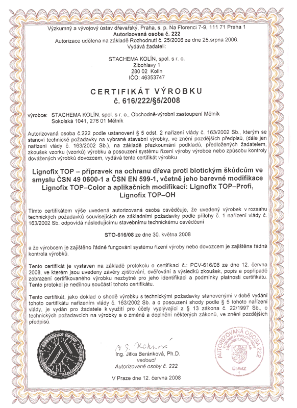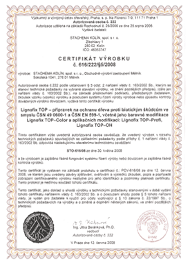 Сертификаты препаратов LignofixЧешские сертификаты - обновляюся регулярно и выдаются авторизованным лицом 222 - Научно-исследовательским институтом леса. Каждой новой выдаче сертификата предшествует проверка предприятия-производителя на соответствие нормам ISO 9001 по менеджменту качества. Сертификаты подтверждают не только эффективность применения препаратов Lignofix по назначению, но и их безопасность для человека, высокую экологичность по строгим нормам, существующим и законодательно закрепленным в странах ЕС.