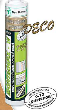 MONTAGEFIX-W - монтажный клей для внутренних работДекоративная отделка Применение:Приклеивание декоратичных элементов из вспененнных материалов, гипса и пробки: карнизы, лепные изделия, потолочные профиля, кессоны, экраны с прогревом. Приклеивание металлических и деревянных отделочных элементов.