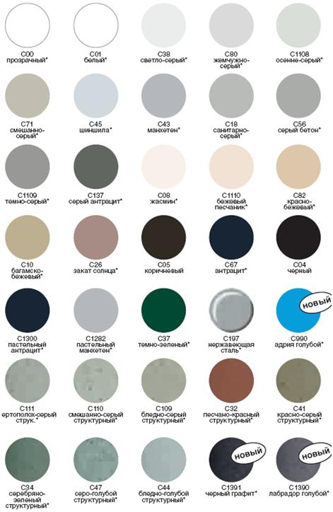 Афоль-пакеты по 400 мл есть в ассортименте следующих цветов: С67 –антрацит, С10-багама-беж, С56 –цементно-серый, С43 –манхеттен, С18-санитарно-серый, С00 – прозрачный, С01 –белый. Для других цветов упаковка предоставляется по требованию. Цвета