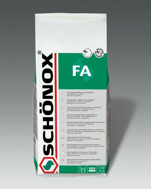 Выравнивающая смесь на основе цементаОписание: Быстротвердеющая самовыравнивающаяся смесь на основе цемента для бетонных оснований. Продукт предназначен для использования на защищаемых внешним покрытием полах в жилых и коммерческих помещениях, больницах, школах и т.д. SCHONOX FA хорошо растекается. Применяется тонким слоем 1–8 мм. Состав быстросохнущий, что означает возможность нанесения покрытия на поверхность обычно уже через 24 часа. Обеспечивает прочную поверхность, пригодную для наклеивания деревянных полов. SCHONOX FA можно перекачивать насосами. Подходит для термополов.