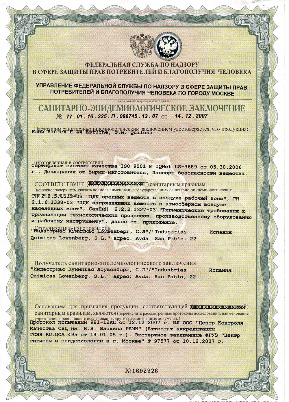 Сертификаты QUILOSA