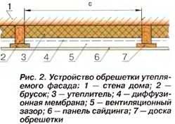 После укладки утеплителя к брускам крепят степлером мембрану типа «Тайвек» (фото 2), а сверху прибивают доски обрешетки. Благодаря последним между виниловой облицовкой и утеплителем образуется вентиляционный зазор. В качестве утеплителя лучше всего применять минераловатные плиты, обработанные гидрофобизирующим составом.