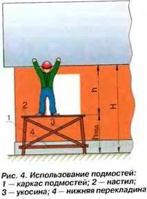 Bысоту подмостей определяют из соотношения: hпод = H-h (рис. 4). Другими словами работник должен не просто дотянуться до карниза, но и работать в удобном положении. В соответствии с этим высота подмостей может быть в пределах 1,3-1,6 м.