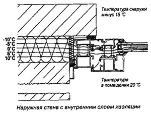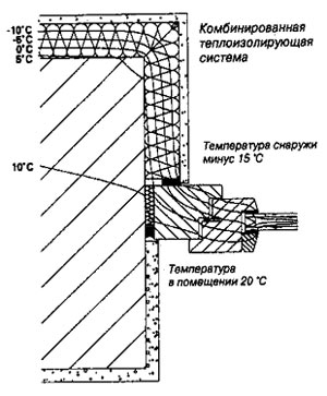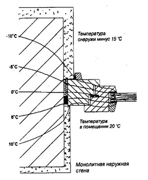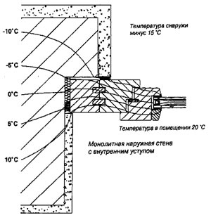 Реакция присоединительного шва на воздействие тепла и влаги определяется климатом внутри и снаружи помещения. Если за расчётные принять следующие климатические условия (по DIN 4108, часть З): в помещении температура 20 °С, относительная влажность воздуха 50%, снаружи температура минус 15 °С, относительная влажность воздуха 80%, то в помещении точка росы при заданных характеристиках микроклимата составляет примерно 9,3°С (для упрощения округляем до 10 °С). Понятно, что при таких условиях температура в критических зонах строительной конструкции не должна опускаться ниже 10 °С, иначе образуется конденсат.