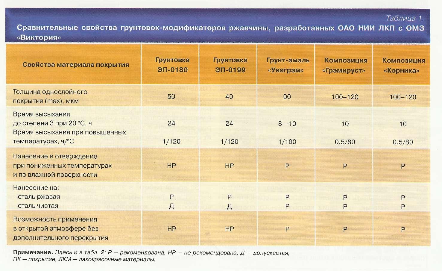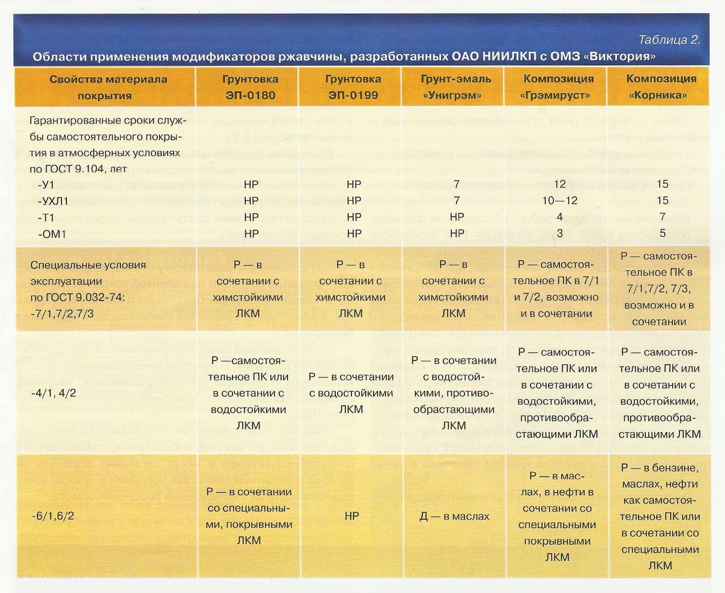Наиболее эффективными ПАВ, как показали исследования [3], являются четвертичные аммониевые основания, которые могут применяться и в качестве модифицирующей добавки в составах для нанесения по влажным прокорродировавшим поверхностям. В качестве стабилизаторов ржавчины используются химические соединения с реакционными группами -NH~, -NH2, ОН . В качестве стабилизаторов коррозионного процесса могут быть и ингибиторы коррозии. Они вводятся в лакокрасочный материал в небольших количествах и выбираются в зависимости от природы лакокрасочного материала и условий эксплуатации покрытия. Действие ингибиторов коррозии обусловлено изменением состояния поверхности металла. Ингибитор способен уменьшать площадь активной поверхности или изменять энергию активации коррозионного процесса вследствие адсорбции на активных точках поверхности. В то же время ингибитор может образовывать с катионами металла устойчивые труднорастворимые соединения — соли или комплексы [4]. Вид ингибитора и его концентрация в составе модификатора ржавчины подбираютсяэкспериментально. Применение ингибитора может вызвать нежелательные последствия, в том числе ослабление изолирующих свойств покрытия и снижение адгезии покрытия. На основании результатов научно-исследовательских работ, проведенных в ОАО НИИ ЛКП с ОМЗ «Виктория», с учетом подходов, обозначенных выше, был разработан ряд эффективных модификаторов ржавчины для защиты от коррозии стали в различных условиях эксплуатации. Разработка и выпуск модификаторов ржавчины базируется на создании модифицирующих ржавчину противокоррозионных композиций, которые предназначены для применения в агрессивной промышленной атмосфере. За время работы в этом направлении с 1975 г. и по настоящее время разработан ряд эффективных противокоррозионных композиций грунтовочного или грунт-эмалевого типов, надежно защищающих металл от атмосферной и химической коррозии (табл. 1). Одним из первых модификаторов ржавчины, разработанных для защиты прокорродировавшего металла в агрессивных условиях эксплуатации, является эпоксидная грунтовка ЭП-0199, обладающая одновременно высокими пенетрирующими, преобразующими и стабилизирующими свойствами. Грунтовка ЭП-0199 хорошо сочеталась с химически стойкими лакокрасочными материалами, комплексная система покрытия обеспечивала срок службы покрытий, нанесенных по ржавой поверхности, в промышленной атмосфере предприятий химической и нефтехимической промышленности до 5 лет. Были разработаны грунтовки ЭП-0180 для окрашивания ржавого металла в средах повышенной агрессивности и грунтовка ЭП-0190 для окрашивания ржавого метала по влажной поверхности. Требования к повышению долговечности покрытий при одновременном воздействии атмосферных факторов и агрессивных сред, а также универсальности применения предопределили разработку грунт-эмали «Унигрэм». По сравнению с другими грунтовками-модификаторами грунт-эмаль «Унигрэм» обладала повышенной долговечностью и декоративностью: ее можно было применять как самостоятельное покрытие. Чуть позже была разработана универсальная противокоррозионная композиция «Грэмируст», предназначенная для окрашивания ржавого и чистого металла, которая позволяет получать на поверхности утолщенные слои, имеет широкую гамму цветовых расцвет