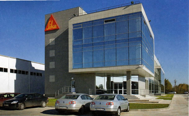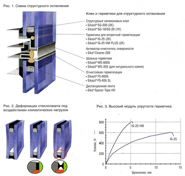 Научно-производственный и складской комплекс SikaTM в Лобне, МО Современные архитектурные тенденции характеризуются постоянным увеличением доли площадей фасадного остекления, обусловленным желанием архитекторов стереть визуальные границы между внешним миром и внутренним пространством здания. Использование структурного остекления позволяет в максимальной степени интегрировать здание в окружающую среду, а также добиться оптимального сочетания эстетической привлекательности, высокой энергоэффективности и длительного срока службы фасадных систем. Но обеспечить этот идеальный баланс можно только при условии надежной склейки деталей светопрозрачных конструкций и применения высококачественных всепогодных уплотнений. Компания SikaTM предлагает архитекторам и строителям широкий ассортимент материалов, предназначенных для реализации инновационных фасадных решений, основанных на использовании стекла в сочетании с другими строительными материалами (металл, бетон, натуральный камень и т.д.). Широкое распространение структурного остекления фасадов — визитной карточки современной архитектуры — во многом обусловлено достижениями строительной химии, обеспечившими реализацию самых амбициозных архитектурных проектов современности. Большая высотность зданий исключает применение традиционных технологий монтажа, подразумевающих использование строительных лесов, поэтому и была придумана модульная конструкция. В этом случае светопрозрачный модуль, полностью собранный в заводских условиях, доставляется на строительную площадку, поднимается на этаж при помощи подъемного крана и монтируется в соответствующем проеме. Точно так же устанавливаются следующие оконные блоки, и в течение рабочего дня бригада из 4-5 монтажников способна выполнить остекление целого этажа. Следует отметить, что для приклеивания элементов структурного остекления (рис. 1) могут применяться только силиконовые составы, поскольку из всего спектра клеевых продуктов только силиконы успешно противостоят разрушительному воздействию ультрафиолетового излучения. Сказанное не означает, что любой силиконовый клей пригоден для этой цели. Клеи и герметики — это химические продукты, которые при определенных условиях могут вступать во взаимодействие друг с другом, и это взаимодействие может повлечь за собой радикальное изменение их свойств. Отсюда возникает проблема несовместимости материалов, которая в лучшем случае приведет к нарушению герметичности стекпопакета, протечкам, подтекам и ухудшению внешнего вида фасада, а в худшем — к разрушению всей конструкции. Но вопросы надежности и долговечности структурного остекления — это лишь часть обширного круга задач, которые приходится решать архитекторам и проектировщикам в процессе разработки фасадных систем. Не меньшее значение имеет и обеспечение требуемых теплоизоляционных характеристик светопрозрачных конструкций. Существенного повышения энергоэффективности структурного остекления можно добиться путем применения стекла с низкоэмиссионным покрытием, а заполнение внутренней полости стекпопакета инертным газом (аргоном) обеспечивает дополнительное (до 20%) снижение потерь тепла через свегопрозрачные конструкции, повышая уровень энергосбережения. Конструкция стекпопакета должна обесп
