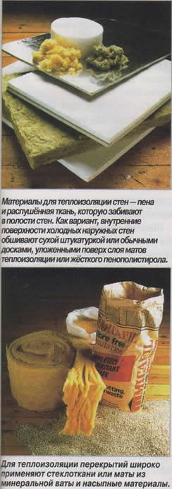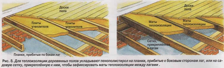 При работе с сухой штукатуркой следует учитывать, что она очень громоздка и для переноски её нужны два человека. Чтобы аккуратно закрепить лист сухой штукатурки на стене у потолка, используют простейший рычаг из обрезка доски, поджимая материал ногой. После обшивки стен устанавливают плинтусы и переставляют розетки и выключатели. Новая стена готова к отделке. Отделка вагонкой.Со шпунтованными досками работать просто. Вагонка не только служит неплохим теплоизолятором, но и выполняет декоративную функцию. Вагонку прибивают гвоздями с лицевой стороны. Лунки над утопленными шляпками гвоздей зашпаклёвывают. Можно использовать очень тонкие гвозди с потайными шляпками, забивая их под углом через шип так, чтобы они закрывались следующей доской. Доски при установке сплачивают лёгким постукиванием. Вы не испортите их, если между бойком молотка и ребром доски вставите деревянную прокладку. Чтобы обеспечить циркуляцию воздуха, надо оставить за досками вагонки маленький зазор. Для качественной отделки потолка и маскировки отпиленных концов вагонки устанавливают бордюрную планку, но и здесь следует обеспечить небольшой зазор. Использование плиток из прессованной пробки.Плитки из прессованной пробки — достаточно хорошая теплоизоляция, но реально они предназначены для уменьшения конденсата на холодных стенах. Чем толще плитка, тем лучше теплоизоляция. Поверхность, к которой её крепят, должна быть гладкой, плоской и сухой. Теплоизоляция полов.Чтобы лаги и доски, а также утеплитель, заложенный внутрь деревянного пола, не отсыревали, под ними должны постоянно циркулировать воздушные потоки. Для этого в фундаменте дома делают продухи, которые никогда не закрывают, иначе может начаться гниение деревянного пола. Если в подполье достаточно места, чтобы туда проникнуть, теплоизоляцию закрепляют между лагами под половыми досками (рис. 8). Можно использовать жёсткий полистирол, нарезав его и уложив на черепные бруски, прибитые к боковым сторонам лаг. Иногда используют вариант, когда лёгкий мат теплоизоляции подвешивают с помощью садовой сетки, прикреплённой к лагам. Если подполье невысокое, придётся вскрывать старый пол.