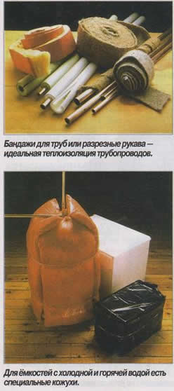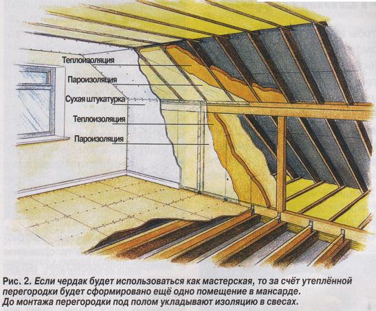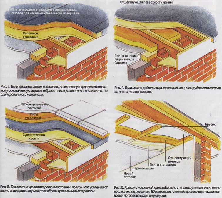 Но одно место на чердаке не рекомендуется изолировать. Это пол под танком с холодной водой. Любое тепло, поднимающееся вверх из помещения под ним, поможет предотвратить замерзание воды зимой. Также следует изолировать верхнюю поверхность люка, ведущего на чердак. На холодном чердаке должны быть изолированы все водопроводные трубы и танк. Трубы можно укутать бандажом из стеклоткани или пенополиуретановыми рукавами с продольным разрезом, благодаря которому их можно надевать на трубы. Чтобы они прочно держались на месте, кожухи надо обмотать лентой. Особое внимание обращают на изгибы. Танк можно закрыть специально сделанным утеплённым чехлом или плитами из пенополистирола. У танка должна быть крышка, предохраняющая воду в нём от замерзания и от попадания мусора. Не забудьте и о баке с горячей водой. Его лучше изолировать специальным чехлом. Тёплый чердак.Если помещение под крышей будет активно использоваться, то его надо утеплять всерьёз (рис. 2). При использовании чердака только в качестве склада или мастерской достаточно выстелить изнутри поверхность крыши пергамином или строительной бумагой с фольгированной подложкой. Это позволит перекрыть любые сквозняки и протечки от дождя через щели между плитками или листами шифера. Бумага с фольгированной подложкой отражает тепло и обеспечивает лучшую теплоизоляцию по сравнению с обычным пергамином. Эту бумагу крепят к стропилам горизонтальными полосами. Укладывают её от конька к свесу, перекрывая полосы на несколько сантиметров. Фольга должна всегда быть со стороны помещения. Дополнительное утепление обеспечивают обшивкой стен изнутри вагонкой, гипсокартоном и пр. Крепёжные элементы могут надорвать бумагу, а ветер, продувающий через крышу, со временем увеличит разрыв. Поэтому желательно применять крепёж, используя прокладки. Если необходимо устроить под чердаком помещение с комфортной температурой для проживания, то после крепления бумаги с фольгированной подложкой или пергамина между стропилами закладывают маты или плиты утеплителя. Чтобы закрепить края бумаги или пергамина, их края фиксируют тонкими рейками на боковых сторонах стропил. Между обрешёткой, на которой держатся элементы кровли, и бумагой надо оставить зазор около 50 мм. После крепления плёнки пароизоляции окончательно прибивают к стропилам панели из гипсокартона. Плоские крыши.Если плоская крыша нуждается в капитальном ремонте (рис. 3), то в этом случае устраивают сплошной настил, поверх которого укладывают твёрдые плиты утеплителя с внешней поверхностью, готовой для настилки битуминизированного кровельного материала. Если же нужна лучшая теплоизоляция (рис. 4), то между балками перекрытия размещают плиты пенополистирола или минерало-ватные маты теплоизоляции. При сохранившейся в удовлетворительном состоянии кровле (рис.5) поверх неё укладывают плиты теплоизоляции из пенополистирола и настилают лёгкие кровельные плитки. В другом случае (рис. 6) к существующему потолку прибивают бруски сечением 50x100 мм и между боковыми поверхностями брусков размещают маты теплоизоляции или плиты пенополистирола. После этого крепят плёнку пароизоляции из полиэтилена и крепят гипсокартон.