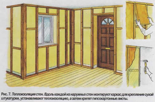 Возможны и другие варианты теплоизоляции. Можно сделать новый потолок из шпунтованных досок и заполнить пространство над ним плитами пенополистирола или матами теплоизоляции. Так как дерево само по себе обладает превосходными теплоизолирующими качествами, то это достаточно эффективный способ. Наконец, можно использовать подвесной потолок с заложенным внутрь утеплителем. Стены.Для дома каркасной конструкции самый простой способ утепления — заполнить пустоты между элементами каркаса эффективным изолятором. Обычно это делают изнутри дома. Если на старой стене нет выключателей, дверей или окон, работа эта очень простая. В противном случае выключатели и розетки надо переставлять на новую обшивку. Кроме того, в ней придётся выпилить проёмы для окон и дверей. Для работы лучше всего подходят два типа сухой штукатурки. Выбор зависит от вида стены, которую вы будете утеплять. Когда стена ровная, можно использовать так называемую тепловую доску с паровым затвором. В этом случае панели крепят непосредственно к поверхности стены специальным клеем и дополнительно фиксируют гвоздями. «Тепловая» доска — обычная сухая штукатурка, соединённая через полиэтиленовую плёнку с подложкой из полистирола. Если стена неровная (рис. 7), то для крепления стандартной сухой штукатурки придётся сделать каркас из брусков. Сухую штукатурку можно легко резать пилой с мелким зубом или острым ножом, обеспечивающим более чистый срез. Отверстия можно выпилить лобзиком.