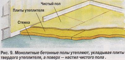 Теплоизоляция бетонных полов.При утеплении бетонных полов (рис. 9) поднимается отметка чистого пола. На бетонную поверхность пола укладывают жёсткие плиты из полистирола толщиной 50 мм, а затем листы ДСП. В конечном итоге пол поднимется почти на 70 мм. Очевидно, при этом придётся полностью освободить помещение, переставить плинтусы (их крепят к новому полу), подрезать двери и добавить скошенные планки у порогов (если пол в соседних помещениях остаётся на прежнем уровне).