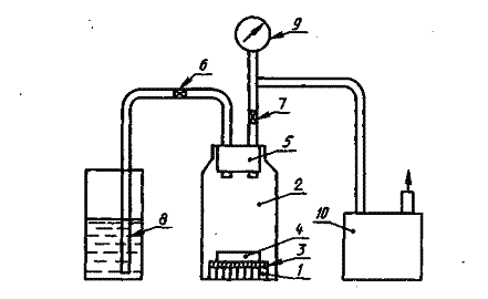1 - образцы древесины; 2 - пропиточный сосуд; J - сетка; 4 - противовсплывнос устройство; 5 - пробка; 6, 7 - краны; 8 - сосуд с раствором испытуемого защитного средства; 9 - вакуумметр; 10 - вакуумный насос Рисунок 1 Установка для сжигания образцов (рисунок 2). Весы лабораторные по ГОСТ 24104 с погрешностью взвешивания не более 0,02 г. Весы лабораторные по ГОСТ 24104 с погрешностью взвешивания не более 0,005 г.