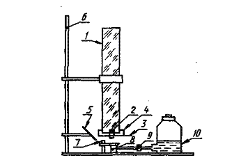 1 - труба из кварцевого стекла с внутренним диаметром 90 мм, толщиной стенки 5 мм и длиной 800 мм; 2 - образец древесины; 3 - игла для крепления образца; 4 - держатель иглы; 5 - зеркало; 6 - штатив; 7 - заслонка; 8 - устройство для поджигания; 9 - шланг с зажимом; 10 - емкость для спирта Рисунок 2 Секундомер с ценой деления: секундной шкалы - 0,2 с; минутной шкалы - 1,0 мин. Эксикатор с осушающим веществом. Бюксы металлические с крышкой вместимостью 50 см . Шило. Чашки Петри. Сетка металлическая или из нержавеющего материала. Противовсгтлывнос устройство (груз). Спирт денатурированный. Вода дистиллированная по ГОСТ 6709. Бумага фильтровальная по ГОСТ 12026. Органический растворитель. 6 ПРОВЕДЕНИЕ ИСПЫТАНИЯ 6.1 Образцы древесины перед пропиткой маркируют и кондиционируют при температуре (20 ± 2) °С и относительной влажности воздуха (65 ± 2) % до достижения ими равновесной влажности. Перед пропиткой образцы взвешивают с погрешностью не более 0,005 г. На всех стадиях испытания, кроме 6.4, взвешивают каждый образец. 6.2 Растворы защитных средств готовят весовым или весообъ-емным способом. В качестве растворителя используют, в зависимости от вида защитного средства, дистиллированную воду или органические растворители. 6.3 Испытание по каждому заданному поглощению проводят не менее чем три раза на десяти образцах. 6.4 Для расчета концентрации защитного средства в растворе определяют пропиточную емкость древесины. Пропиточную емкость образцов, изготовленных для испытаний, определяют по растворителю не менее чем три раза на десяти образцах. Пропиточную емкость образцов в одном испытании Р в килограммах на кубический метр вычисляют по формуле где m - масса образца древесины до пропитки, г; m1 - масса образца древесины после пропитки, г; V - объем образца древесины, см . По значению пропиточной емкости образцов древесины в одном испытании вычисляют среднюю пропиточную емкость РСр для всех испытаний по формуле