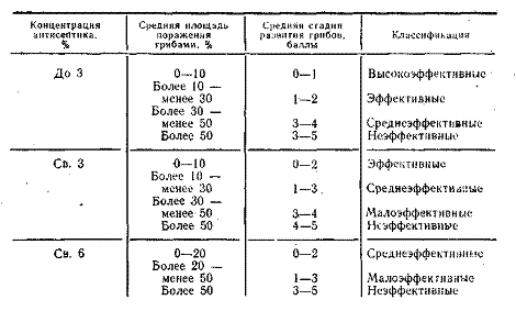 5. ОБРАБОТКА РЕЗУЛЬТАТОВ 5.1. Среднюю площадь поражения грибами поверхности образцов в процентах определяют как отношение суммы площадей, пораженных грибами, к общей площади образцов. 5.2. Оценку стадии развития грибов на образцах в баллах проводят по щестибалльной шкале с учетом характеристик, приведенных ниже: '. 0 - абсолютно чистые образцы при визуальном осмотре и под микроскопом; t 1 - визуально чистые образцы; при осмотре под микроскопом видны мелкие очаги в виде пятен одного вида деревоокрашивающих или плесневых грибов; стадия спороношения отсутствует; 2 - поверхностное развитие мицелия отдельных видов деревоокрашивающих и плесневых грибов в виде пятен; стадия спороношения отсутствует; 3 - обильное разрастание мицелия отдельных видов деревоокрашивающих и плесневых грибов; начало стадия спороношения одного из видов грибов; 4 - отчетливо виден рост грибов при визуальном осмотре; различные стадии спороношения большинства видов деревоокрашивающих и плесневых грибов; 5 - глубокое поражение деревоокрашивающими и плесневыми грибами всей площади образца; интенсивное спароношение. 5.3. С учетом полученных результатов антисептики по защищающей способности классифицируют следующим образом:
