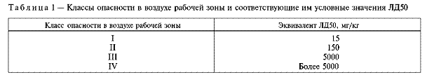 где ЛД50 - летальная доза химического вещества, вызывающая при введении в организм гибель 50 % животных, мг/кг; S- коэффициент, отражающий растворимость компонентов в 100 г растворителя. S определяют делением на 100 значения растворимости вещества (г) в 100 г растворителя при 25 °С. Значение коэффициента S находится в интервале от 0 до 1; F- коэффициент летучести компонента; С - содержание данного компонента в общей массе препарата, кг/кг или т/т. Поскольку ЛД50 известны не для всех химических соединений, для тех соединений, для которых ЛД50 неизвестен, для расчета можно использовать эквивалент ЛД50, определяемый по показателю класса опасности в воздухе рабочей зоны по таблице 1.
