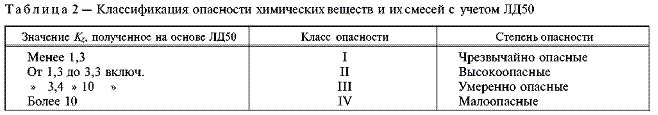 где n - число ведущих компонентов в смеси, имеющих минимальное значение K1 (n < 3); Ki - индекс токсичности i-го компонента. Класс опасности химических веществ и их смесей, соответствующий суммарному индексу токсичности Kv с учетом ЛД50 определяют по таблице 2.