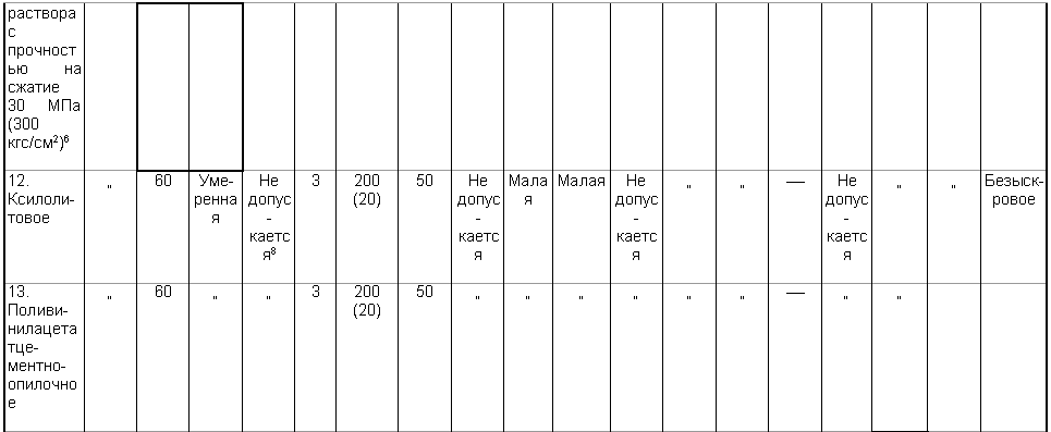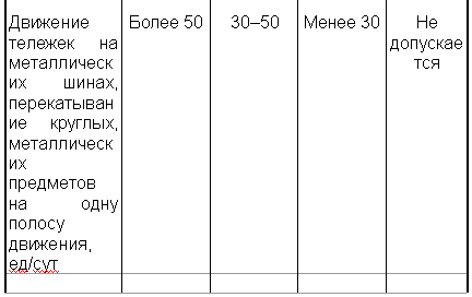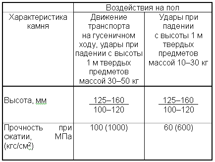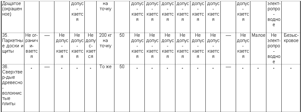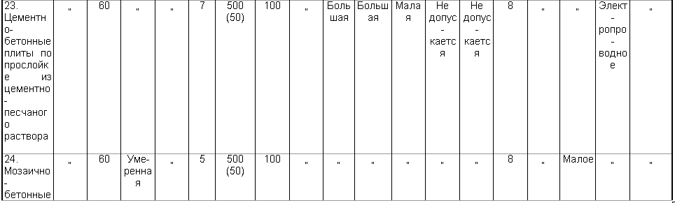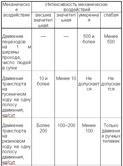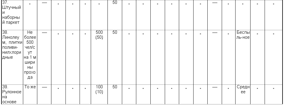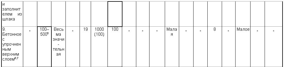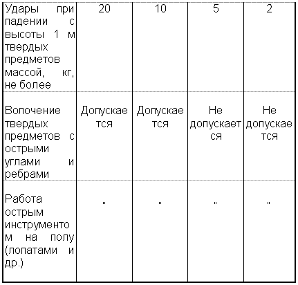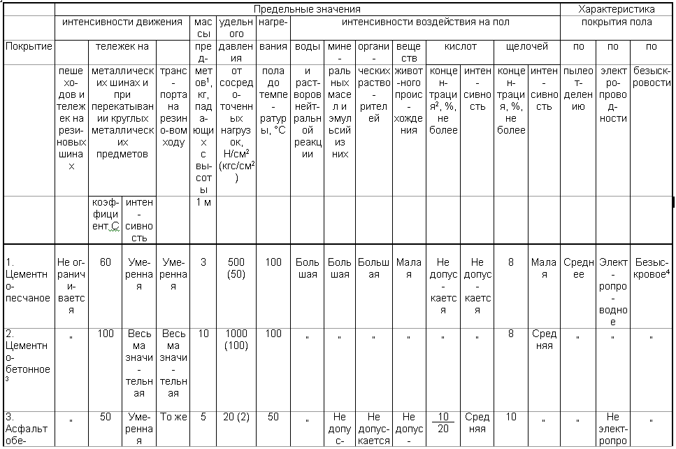 Обозначение, принятое в таблице: С коэффициент давления на пол металлических шин и круглых металлических предметов, определяемый по формуле: где P наибольшее давлениеколеса или обода на пол, Н (кгс); b ширина шины колеса или обода, см; D диаметр колеса или обода, м. 1 Твердых (металлических, каменных) предметов, падающих на различные места пола (сбрасывание грузов с автомобилей, тележек, перекидывание деталей). При падении предметов на одно и то же место пола с высоты 1 м (у отверстий, желобов, установочных мест и пр.) массу, указанную в таблице, необходимо уменьшать в 2 раза, а при падении с высоты 0,5 м - увеличивать в 1,5 раза. Воздействия на пол при волочении твердых предметов с острыми углами и ребрами условно можно приравнять к ударам, действующим на различные места пола при падении с высоты 1 м твердых предметов массой 10 кг, а при работе острыми металлическими инструментами (лопатами и пр.) - к ударам при падении с высоты 1 м твердых предметов массой 5 кг. 2 Над чертой указаны: азотная, серная, соляная, фосфорная, хлорноватистая, хромовая, уксусная; под чертой - масляная, молочная, муравьиная, щавелевая кислоты. Наибольшая концентрация указанных кислот принята равной 100 %. 3 Допускается движение гусеничного транспорта значительной интенсивности. 4 Допускается только при применении щебня, песка, исключающих искрообразование при ударах металлическими или каменными предметами. 5 Покрытия, допускающие воздействия, отмеченные рамкой, следует применять только в сочетании с воздействиями, отмеченными подстрочной чертой. Покрытия, для которых в таблице отсутствуют воздействия, отмеченные подстрочной чертой, следует применять только при наличии воздействий или требований, отмеченных рамкой. 6 Допускается движение гусеничного транспорта без ограничения интенсивности. 7 Для упрочнения бетонного покрытия с упрочненным верхним споем следует применять сухие смеси цемента с железным порошком, окалиной и другими металлосодержащими отходами крупностью не более 5 мм. 8 За исключением нерегулярного (эпизодического) движения пешеходов, а также транспорта на резиновом ходу числом не более 10 ед/сут. 9 Допускаются только в помещениях, запыленность воздуха в которых приводит к нарушению нормального режима работы технологического оборудования и транспорта, оснащенного числовым программным управлением. 10 Воздействие уксусной кислоты не допускается. 11 Допускается, как правило, в помещениях с повышенными санитарно-гигиеническими требованиями. 12 Для окислительных сред допускается не более 5 %. Примечание. Типы покрытий следует применять при воздействиях, не превышающих ограничений, установленных таблицей. ПРИЛОЖЕНИЕ 2