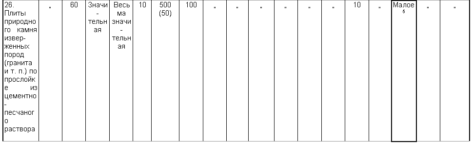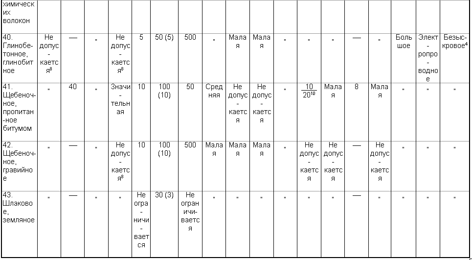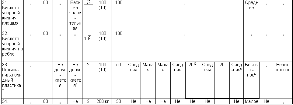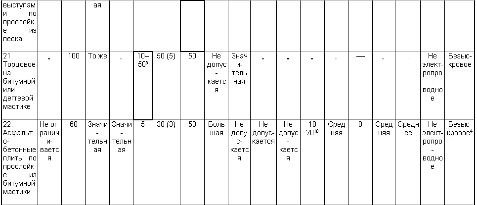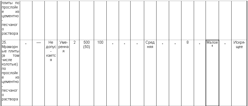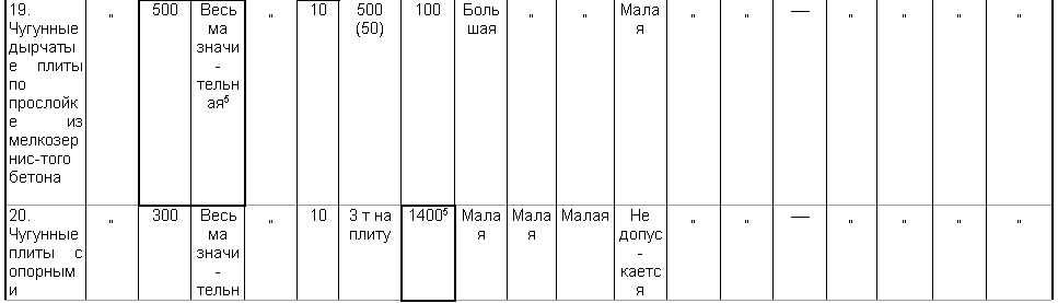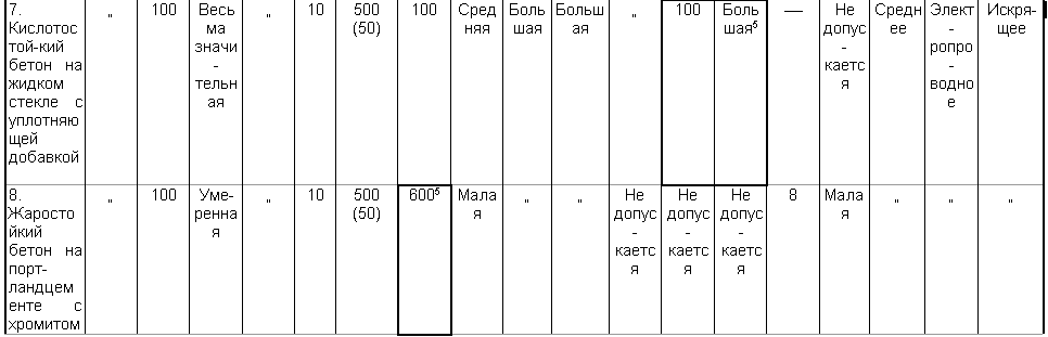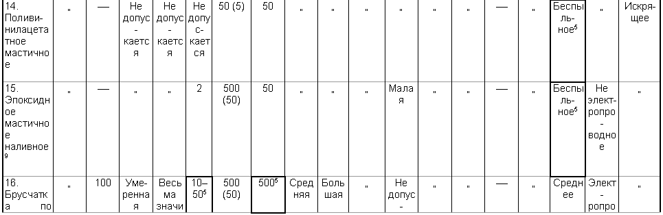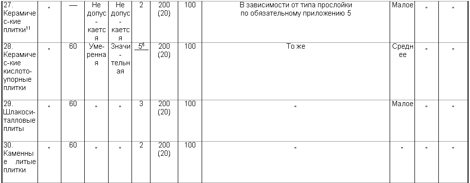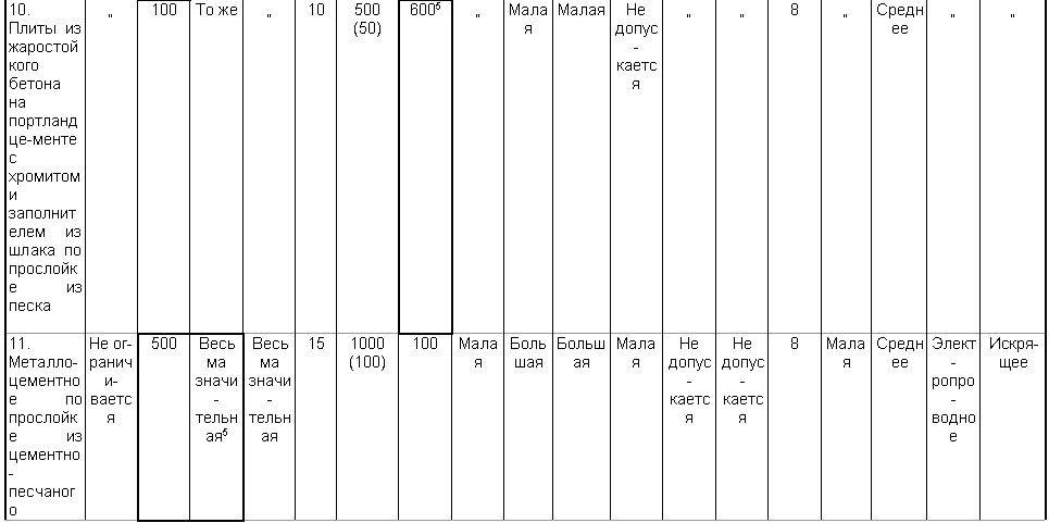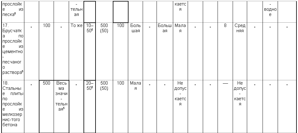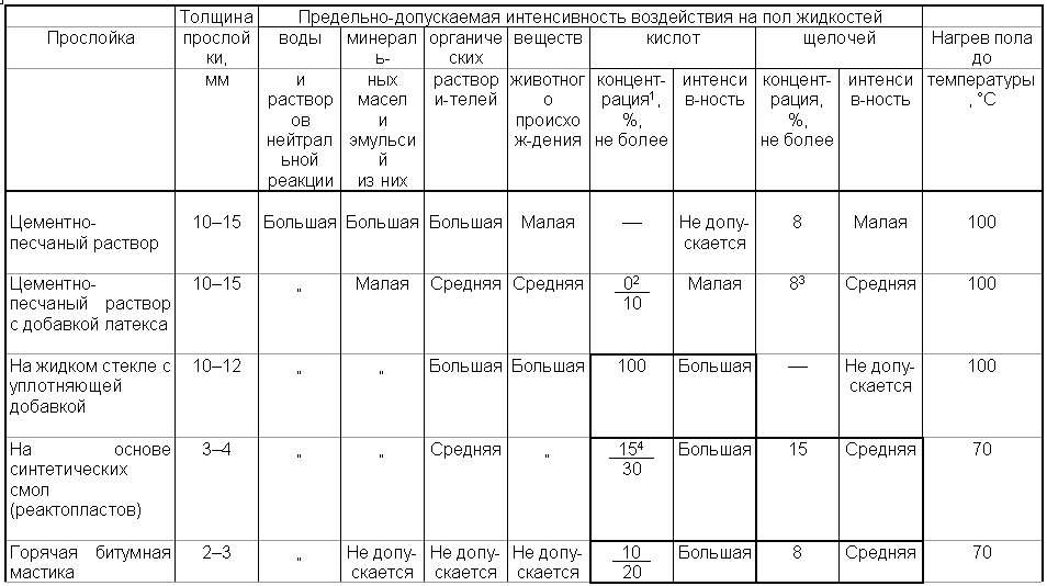 1 См. сноску 2 к прил. 1. 2 При заполнении швов полимерными мастиками 5_ %. 3 При заполнении швов полимерными мастиками 15 %. 4 Для окисляющих сред не более 5 %. 5 При установке на пол горячих предметов, деталей, проливах расплавленного металла и т. п., нагреве воздуха на уровне пола. Примечания: 1. Температурой пола условно считается температура воздуха на уровне пола или температура горячих предметов при контакте с полом. 2. Приведенный в таблице тип прослойки может быть применен при воздействиях, не превышающих ограничений, установленных в таблице. Прослойки, допускающие воздействия, отмеченные рамкой, применяют только при наличии таких воздействий. |