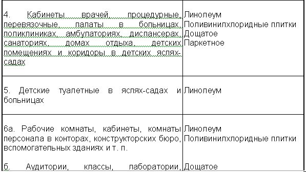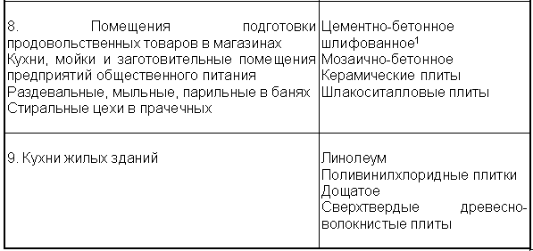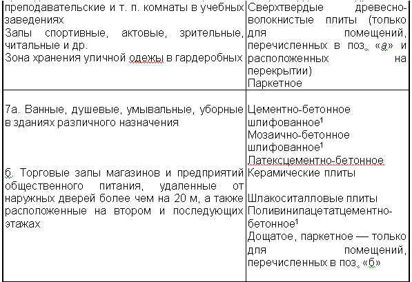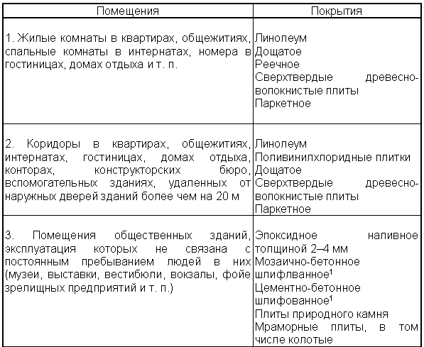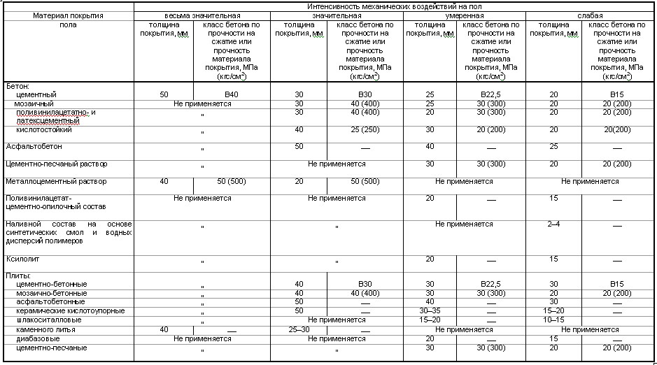 1 Для покрытий следует применять бетон класса не ниже В15. Примечания: 1. Покрытия из линолеума и поливинилхлоридных плиток допускаются при интенсивности движения пешеходов, не превышающей 500 чел/сут на 1 м ширины прохода. 2. Шлакоситалловые плиты, применяемые для покрытий полов бань в помещениях с мокрым режимом, должны иметь рифленую лицевую поверхность. 3. Выбор типа покрытий полов помещений, в которых воздействия на полы аналогичны воздействиям в производственных помещениях, следует осуществлять по табл. 2. ПРИЛОЖЕНИЕ 3