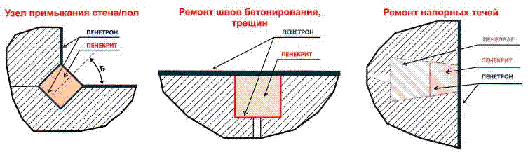 Особенности материалов проникающего действия системы "Пенетрон"Приводятся выдержки из второй части "Технического регламента на применение материалов системы "Пенетрон", в которой рассказывается об областях применения материалов, описываются особенности подготовки поверхности, приготовления составов и технология выполнения гидроизоляционных работ. Технология применения материалов "Пенетрон" не предусматривает сложной и длительной подготовки поверхности: они применяются по влажной поверхности, это исключает необходимость предварительной ее сушки, что значительно снижает затраты при выполнении работ. Материалы просты в использовании, следует лишь четко соблюдать инструкцию по применению. Действие материалов системы "Пенетрон" одинаково эффективно как с внешней, так и с внутренней стороны конструкции, независимо от направления давления воды; их использование приводит к значительному повышению марки бетона по водонепроницаемости, увеличивает показатели морозостойкости и прочности бетона. В случае механического повреждения обработанной поверхности приобретенные высокие гидроизоляционные и защитные свойства бетонной конструкции сохраняются, а обработанный бетон приобретает способность к "самозалечиванию". Обработанный материалом "Пенетрон", бетон или бетон с добавкой "Пенетрон Адмикс" сохраняет паропроницаемость, приобретает коррозийную стойкость к воздействию агрессивных сред и высокие гидроизоляционные свойства даже при наличии высокого радиационного воздействия. Таким образом, применение материалов позволяет обеспечить долговечную гидроизоляцию - на весь срок службы бетонного сооружения; данный вид гидроизоляции можно назвать наиболее эффективным и экономичным в сравнении с другими видами и способами. Материалы "Пенетрон" применяются на строящихся и эксплуатируемых сооружени ях всех типов трещиностойкости, даже при воздействии высокого гидростатического давления. Они не токсичны, не горючи, не взрывоопасны, радиационно безопасны, сертифицированы для использования в резервуарах с питьевой водой и имеют длительный срок хранения - 18 месяцев с даты производства при условии ненарушенной герметичности заводской упаковки. Их использование позволяет предотвратить коррозию арматуры в железобетоне. Область применения Материалы применяются для устройства и восстановления гидроизоляции существующих и находящихся в стадии строительства монолитных и сборных бетонных и железобетонных конструкций всех категорий трещиностойкости марки не ниже М100. Ниже приведены некоторые типы сооружений, в которых используются материалы системы "Пенетрон". Гидротехнические сооружения: резервуары (открытые, обвалованные и т.д), бассейны (открытого и закрытого типа), колодцы, доки, причалы, конструкции очистных сооружений (аэротанки, отстойники, коллекторы, насосные и т.д.), бетонные дамбы, плотины и т.д. Объекты жилищного и коммерческого строительства:фундаменты, подвальные помещения, подземные сооружения (парковки, гаражи, переходы и т.д.), балконы, эксплуатируемые и неэксплуатируемые кровли, лифтовые шахты, овощные ямы и т.д. Сооружения промышленного и агропромышленного назначения: производственные помещения, бассейны градирен, хранилища, дымовые трубы, шахты, бункеры, бетонные сооружения, подверженные агресси
