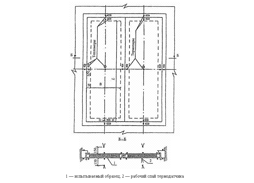 7.4 Термопары на поверхностях образца оконного блока устанавливают по вертикальной и горизонтальной осям в центрах предполагаемых однородных температурных зон светопропускающей и непрозрачной частей, а также в местах теплопроводных включений (рисунок 2). Для оценки геометрических границ однородных зон может быть использован метод моделирования процесса теплопередачи через светопрозрачные ограждающие конструкции на ЭВМ (приложение В) с последующим их уточнением экспериментальным методом по 8.2.