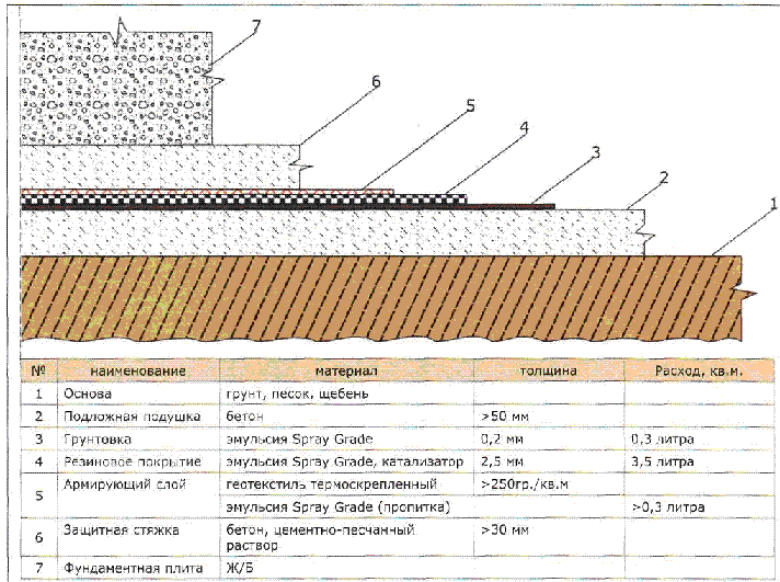 Описание процесса: После устройства котлована под фундамент, подготавливается основание для подложной подушки, с устройством песчанно-щебневой подушки. Далее выполняется устройство подложной подушки с последующим созреванием. На чистую, сухую, обеспыленную поверхность готового бетонного основания подложной подушки пошагово наносится грунтовка, тонким слоем, без образования скоплений в виде луж, с одновременным пошаговым нанесением резинового покрытия до толщины не менее 3 мм. После полного высыхания резинового покрытия (не менее 48 часов), при температуре окружающей среды 20°С и влажности воздуха 50%, укладывается геотекстиль, в качестве защиты резинового покрытия от возможного повреждения во время устройства последующих слоев. При укладке, геотекстиль следует фиксировать путем приклеивания к резиновому покрытию с помощью грунтовки. Для этого перед укладкой рулона геотекстиля, на резиновое покрытие пошагово наносится грунтовка путем распыления, с одновременно пошаговой укладкой геотекстиля и плотной фиксацией с помощью подручных инструментов (щетки). После высыхания клеящего слоя геотекстиля, выполняется устройство защитной стяжки, предохраняющей резиновое покрытие от повреждений во время устройства фундаментной плиты. Затем, после созревания раствора защитной стяжки, выполняется устройство фундаментной плиты. Обшие требования к основанию: Основание сухое, чистое, без трещин, раковин, с хорошей когезией, без материалов и покрытий, снижающих адгезионную способность жидкой резины. |