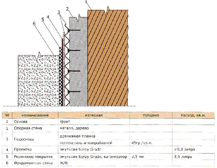 Описание процесса: Для нанесения резинового покрытия на фундаментную стену, необходимое расстояние между опорной стеной и фундаментной стеной составляет не менее 800 мм. Сначала выполняется устройство подосновы из дренажной пленки с приклеенным геотекстилем. Дренажная пленка укладывается в стык, при этом геотекстиль внахлест на предыдущий лист дренажной пленки. С помощью грунтовки выполняется фиксация в местах примыкания геотекстиля внахлест на дренажную пленку, путем распыления. На чистую, сухую, поверхность подосновы пошагово наносится грунтовка, тонким слоем, без образования подтеков с полной пропиткой, и одновременным пошаговым нанесением резинового покрытия до толщины не менее 2,5 мм. После полного высыхания резинового покрытия (не менее 48 часов), при температуре окружающей среды 20°С и влажности воздуха 50%, выполняется устройство Ж/Б стены фундамента, согласно проектно-технической документации. Обшие требования к основанию: Основание сухое, чистое, без трещин, раковин, с хорошей когезией, без материалов и покрытий, снижающих адгезионную способность жидкой резины. |