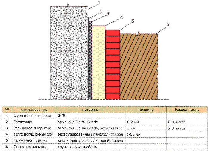Гидроизоляция фундаментной стены с теплоизоляционным слоем
