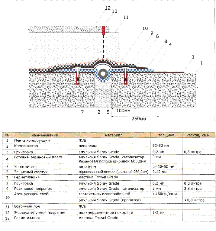 Описание процесса: На чистую, обеспыленную поверхность основания перекрытия наносится грунтовка, тонким слоем, без образования скоплений в виде луж. Огрунтовке подлежит сектор по 250 мм на каждой плите деформационного шва, по всей длине. Готовый резиновый пласт укладывается вглубь шва, с образованием углубления, и нахлестом на каждую плиту по 200 мм. В образовавшееся углубление укладывается уплотнитель - вилатерм, по всей длине шва. Затем укладывается и фиксируется защитный фартук. Цель данного фартука сохранение свободы движения готового резинового пласта, и защиты от давления выше расположенных слоев. На чистую, сухую, обезжиренную поверхность фартука и резинового покрытия пошагово наносится грунтовка, тонким слоем, без образования подтеков и скоплений в виде луж, с одновременным пошаговым нанесением резинового покрытия до толщины не менее 2 мм. После полного высыхания резинового покрытия (не менее 48 часов), при температуре окружающей среды 20°С и влажности воздуха 50% , выполняется устройство защитного слоя из геотекстиля. При укладке, геотекстиль следует фиксировать путем приклеивания к резиновому покрытию с помощью грунтовки. Для этого перед укладкой рулона геотекстиля, на резиновое покрытие пошагово наносится грунтовка путем распыления, с одновременно пошаговой укладкой геотекстиля и плотной фиксацией с помощью подручных инструментов (щетки). Далее выполняется устройство бетонного пола. В качестве эксплуатируемого покрытия применяются различные полимерцементные покрытия, общей толщиной 1-3 мм. После полного высыхания бронирующего покрытия, выполняется устройство штрабы, путем прореза полосы шириной равной толщине диска (3-4 мм) и глубиной не менее одной трети всей толщины бетонного пола и эксплуатируемого покрытия. С помощью компрессора и строительного пылесоса выполняется очистка и обеспыливание штрабы до полного отсутствия пыли. Затем выполняется заполнение штрабы гидроизоляционной мастикой Trowel Grade шпателями вручную, до выравнивания. Обшие требования к основанию: Основание сухое, чистое, без трещин, раковин, с хорошей когезией, без материалов и покрытий, снижающих адгезионную способность жидкой резины. |