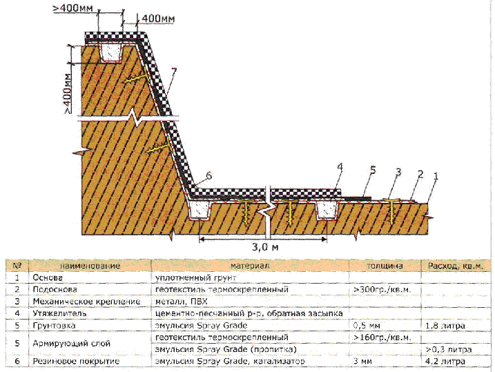 Описание процесса: В первую очередь формируется чаша искусственного водоема с уплотнением грунта и устройством траншей под утяжелители. На уплотненное основание укладывается геотекстиль в качестве подосновы, плотно, без складок внахлест. Затем выполняется устройство утяжелителей, путем засыпки грунта или заливки цементно-песчанного раствора в траншеи. Данные утяжелители необходимы для надежной фиксации подосновы и всей чаши водоема. Подоснова фиксируется с помощью механического крепления по периметру, в местах примыканий, изгибов и по плоскости, в местах нахлеста подосновы друг на друга. Далее, на чистую подоснову наносится грунтовка в местах расположения утяжелителей и механического крепления. Огрунтовке подлежит зона подосновы вдоль утяжелителя, с каждой стороны по 200-250 мм, и квадрат 150X150 мм вокруг механического крепления. В качестве армирующего материала, на огрунтованную зону укладывается термоскрепленный геотекстиль (неоплавленной стороной к основанию), пропитанный грунтовкой, плотно без складок. После частичного высыхания армирующего покрытия, выполняется пропитка геотекстиля путем распыления грунтовки по всей поверхности основания, равномерно, с полной пропиткой подосновы. Грунтовка наносится пошагово с одновременным пошаговым нанесением резинового покрытия, до финальной толщины не менее 3 мм. Обшие требования к основанию: Основание сухое, чистое, без порезов. Без материалов и покрытий, снижающих адгезионную способность жидкой резины. |