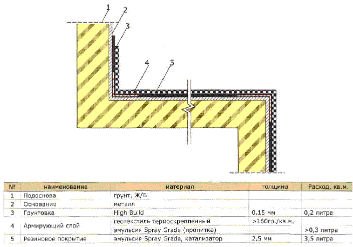 Описание процесса: В первую очередь необходимо полностью очистить металлическую поверхность основания от масленых пятен, коррозии и лакокрасочных покрытий с плохой адгезией. Затем, на чистую, сухую, обеспыленную поверхность основания в качестве грунтовки наносится High Build, кистью вручную, тонким слоем, без образования подтеков. После полного высыхания грунтовки, в течение 24 часов при температуре окружающей среды 20°С и влажности воздуха 50%, выполняется армирование внешних и внутренних углов. В качестве армирования применяются полоски термоскрепленного геотекстиля, шириной 200 мм, пропитанные грунтовкой, которые укладываются неоплавленной стороной к основанию. Армирующий материал укладывается с нахлестом по 100 мм на каждую плоскость примыкания, плотно, без складок и воздушных пузырей. Далее, после частичного высыхания армированного покрытия, пошагово наносится резиновое покрытие по всей поверхности основания до финальной толщины не менее 2,5 мм. Полное высыхание резинового покрытия в течение 24 часов при температуре окружающей среды 20°С и влажности воздуха 50% Обшие требования к основанию: Основание сухое, чистое, гладкое, без коррозии, без материалов и покрытий, снижающих адгезионную способность жидкой резины. При выполнении работ в закрытом пространстве необходимо обеспечить наличие исправной приточно-вытяжной системы, функционирующей во время проведения работ и во время высыхания. |