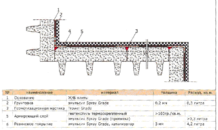 Описание процесса: Удаляется мусор и фрагменты бетона плит, имеющие слабую когезию, в местах межплиточных швов. На чистую, сухую, обеспыленную поверхность межплиточных швов, внешних и внутренних углов наносится грунтовка, тонким слоем, без образования подтеков и скоплений в виде луж. Неровности и углубления межплиточных швов заполняются герметизационной мастикой Trowel Grade, до выравнивания. После частичного высыхания мастики, с образованием черного цвета и появлением упругости, укладывается армирующий материал (неоплавленной стороной к основанию) пропитанный грунтовкой, с нахлестом на каждую плиту примыкания по 100 мм. Через 10-15 минут после частичного высыхания грунтовки с образования черного цвета, наносится грунтовка по всей поверхности основания, тонким слоем, без образования подтеков и скоплений в виде луж. Грунтовка наносится пошагово с одновременным пошаговым нанесением резинового покрытия, до финальной толщины не менее 2,5 мм. Обшие требования к основанию: Основание сухое, чистое, гладкое, без трещин, раковин, с хорошей когезией. Без материалов и покрытий, снижающих адгезионную способность жидкой резины. |