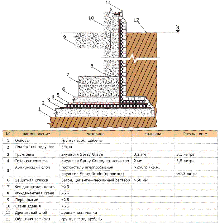 Описание процесса: При устройстве фундаментной плиты, гидроизоляционное покрытие наносится на основание подложной подушки больше на расстояние 150-200 мм с каждой стороны от проектируемой фундаментной плиты. Затем выполняются все последующие операции по устройству фундаментной плиты и стены, согласно проектно-сметной документации. В момент нанесения гидроизоляционного покрытия на стену фундамента, основание резинового покрытия фундаментной плиты должно быть чистое и сухое. Резиновое покрытие наноситься одновременно на стену фундамента и горизонтальную плоскость резинового основания фундаментной плиты. Таким образом, получается единое бесшовное резиновое покрытие всего фундамента (типа "резиновый мешок"). |