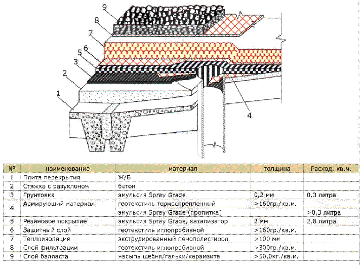 Описание процесса; На чистую, обеспыленную поверхность выравнивающей стяжки наносится грунтовка, тонким слоем, без образования подтеков и скоплений в виде луж. Огрунтовке подлежит квадрат 400X400 мм вокруг воронки и внутренняя часть водоприемной чаши на глубину около 100 мм. Укладывается армирующий материал (неоплавленной стороной к основанию) в квадрате 350X350 мм вокруг воронки и на внутреннюю часть водоприемной чаши, на глубину около 50 - 70 мм. Затем, на чистую, обеспыленную поверхность основания пошагово наносится грунтовка, тонким слоем, без образования подтеков, с одновременным пошаговым нанесением резинового покрытия до толщины не менее 2 мм Через 48 часов, после полного высыхания резинового покрытия при температуре окружающей среды 20° и влажности воздуха 50%, укладывается слой геотекстиля в качестве защиты. Укладывается слой теплоизоляционного материала с последующим устройством фильтрующего слоя из нетканого иглопробивного геотекстиля. В качестве эксплуатируемого покрытия применяется балласт из щебня/гальки/керамзита. Общие требования к основанию; Основание сухое, чистое, без трещин, раковин, с хорошей когезией. Без материалов и покрытий, снижающих адгезионную способность жидкой резины. |