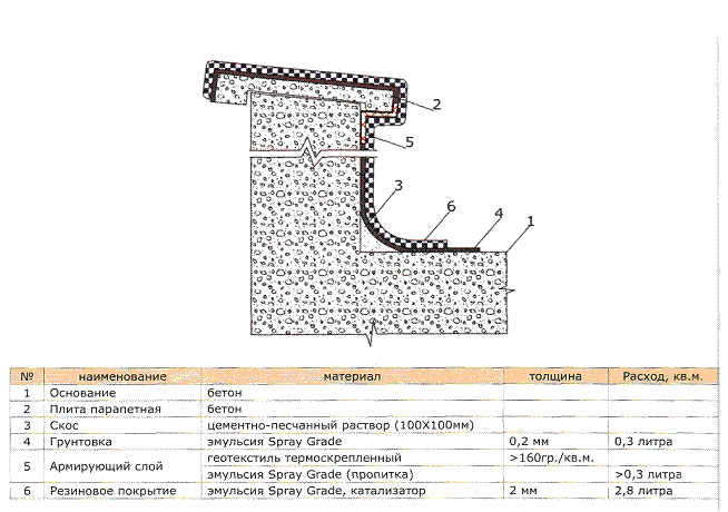 Описание процесса: Из цементно-песчанного раствора выполняется устройство скоса, размером 100X100 мм, в месте примыкания кровли к парапетной стене. Затем, после полного созревания бетона основания и цементно-песчанного раствора скоса, на чистую, сухую, обеспыленную поверхность основания наносится грунтовка, тонким слоем, без образования подтеков и скоплений в виде луж. В месте примыкания парапетной плиты к стене парапета укладывается армирующий материал (неоплавленной стороной к основанию), пропитанный грунтовкой, с целью усиления и устройства единства основания, под резиновое покрытие. Армирующий материал укладывается плотно, без образования складок и воздушных пузырей, с нахлестом на каждую плоскость примыкания по 50-70 мм. После частичного высыхания грунтовки армирующего слоя, в течение 5-10 минут с образованием черного цвета, наносится резиновое покрытие до финальной толщины не менее 2 мм. Обшие требования к основанию: Основание сухое, чистое, без трещин, раковин, с хорошей когезией. Без материалов и покрытий, снижающих адгезионную способность жидкой резины. |